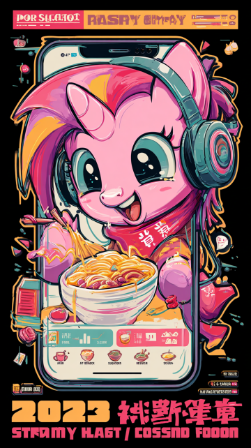 赛博朋克风插画,萌趣独角兽戴耳机吃面,手机界面融合科技与美食,霓虹灯效点缀,潮流感十足,未来感与可爱感碰撞。