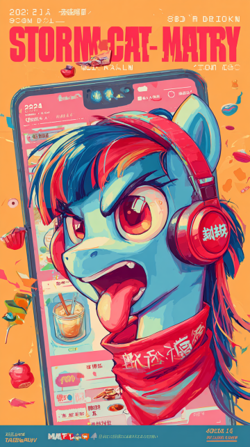 插画风卡通小马拟人形象,佩戴科技感耳机从手机屏幕跃出,融合故障风元素与未来感界面,展现潮流酷炫的数字节日氛围。