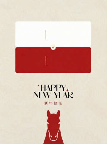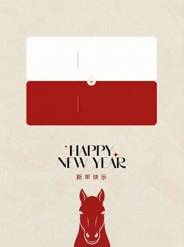 喜庆红金配色,中式剪影马形融合几何渐变,扁平风设计呈现2026年农历新年,鎏金文字增添节日质感。