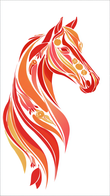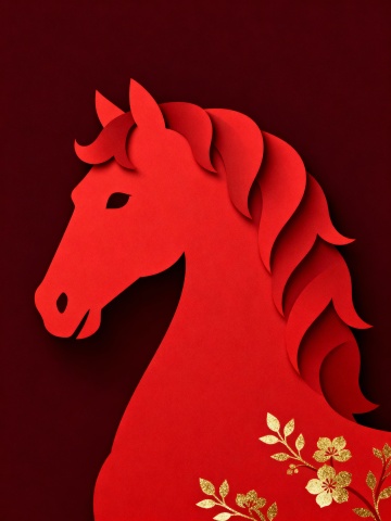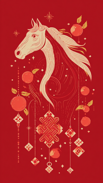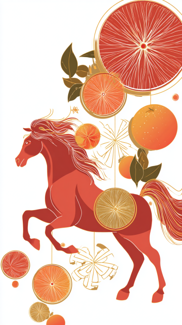 抽象感与剪纸风融合,以红橙渐变勾勒马首轮廓,融入几何线条与果实元素,展现唯美优雅的插画风格,传递新春祥瑞之意。