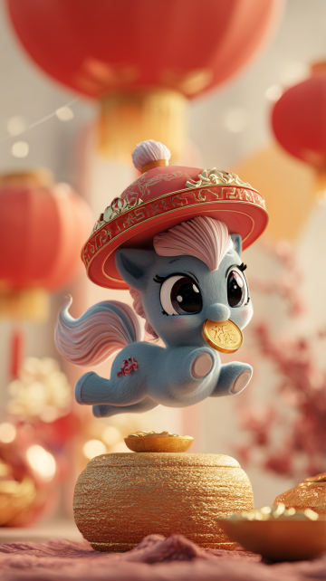 软3D风卡通小马,戴国潮红帽衔金元宝,喜庆氛围浓厚,融合鎏金与粘土质感,节日祝福满满。