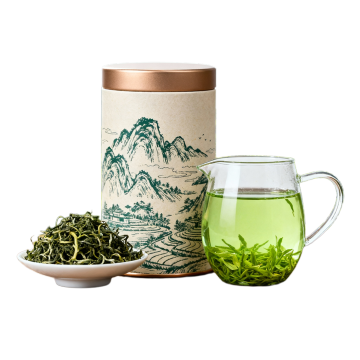 一个白色陶瓷小碗中盛满嫩绿挺直的茶叶,置于深色粗糙石质圆盘上,周围环绕新鲜翠绿的茶树叶片,柔和的晨光透过树叶洒下斑驳光影,营造清新自然的茶园氛围,浅景深特写,主体清晰背景虚化,色调以绿色为主,光影明亮柔和。