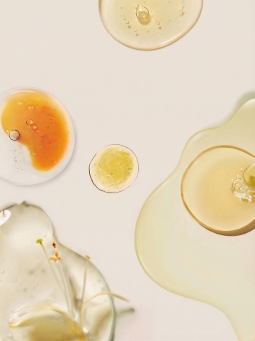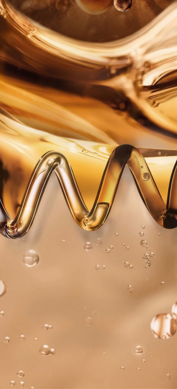 一张符合超写实3D渲染风格的精华液流体图片,画面中半透明大油滴包裹小分子结构和气泡,周围环绕金色波浪状液体与悬浮小油珠,整体营造出奢华、水润、科技感的氛围。