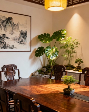 新中式风格室内场景,画面整体以青绿色为主色调,搭配淡雅的米色和深棕色,背景墙采用水墨晕染技法,呈现出青绿色的山峦云雾自然景观,金色的流畅线条勾勒出山势走向并点缀其间,底部有米色区域,上面有金色的书法文字,前景是一张深棕色的木质桌子,桌面上铺着一块带有金色莲花图案的白色桌旗,整体营造出宁静雅致、富有东方韵味的氛围,光影柔和,色彩和谐统一,具有传统与现代结合的设计感。