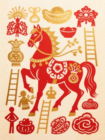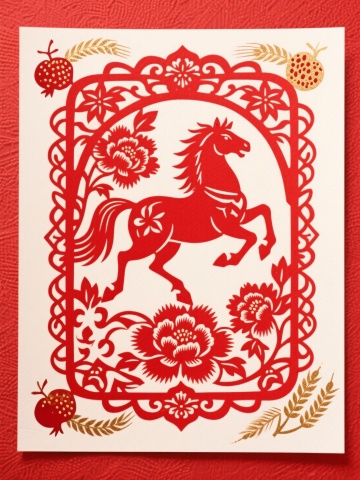 红金双色剪纸风,融合中式吉祥元素,马踏祥云,寓意新春喜庆与国潮风尚。