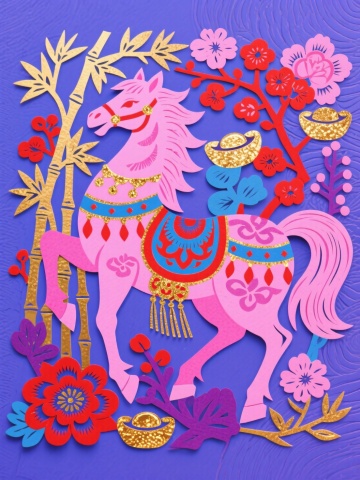 剪纸风与国潮风融合,粉色骏马点缀金饰,搭配竹枝、花卉与元宝,呈现喜庆梦幻的中式年味,充满民族感与甜蜜可爱气息。