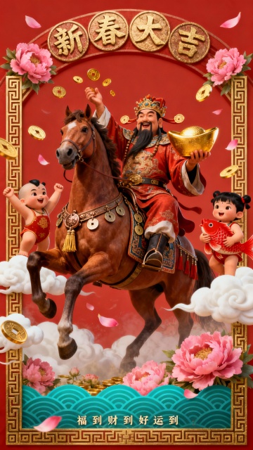 国潮插画风,融合剪纸与鎏金元素,财神骑马携童子跃动祥云,喜庆中式年味十足,传递新春好运与财富祝福。