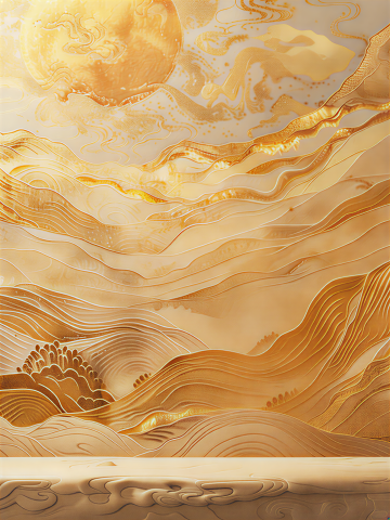 一幅具有浓厚中秋氛围的中国传统风格装饰画,以暖金色为主色调,画面大量留白,采用细腻流畅的线条勾勒出层层叠叠、形态优美的祥云和波浪纹样,云纹卷曲灵动,浪纹飘逸舒展,线条疏密有致,整体呈现出典雅、祥和、喜庆的氛围,具有浓郁的东方美学韵味和节日气息。