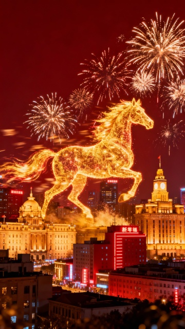 鎏金风3D骏马腾空,粒子光效交织烟花,虚拟现实夜景中绽放喜庆与科技感,光影流动间尽显梦幻酷炫。