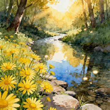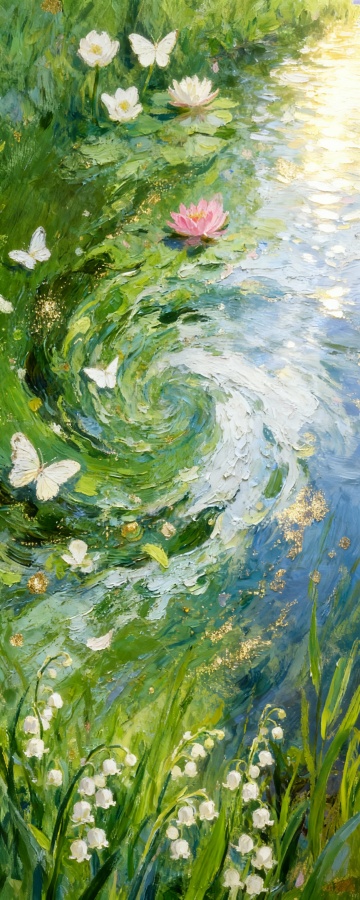 印象派风格描绘的宁静郊外风景,画面以明亮的蓝绿色调为主,阳光透过茂密的树叶洒下斑驳光影,草地呈现出丰富的绿色层次,点缀着白色、粉色和黄色的野花,一条清澈的小溪蜿蜒流过,近景虚化的花朵增添朦胧美感,整体笔触灵动松散,色彩明快且富有光感,营造出温暖和煦、生机勃勃的春日氛围。