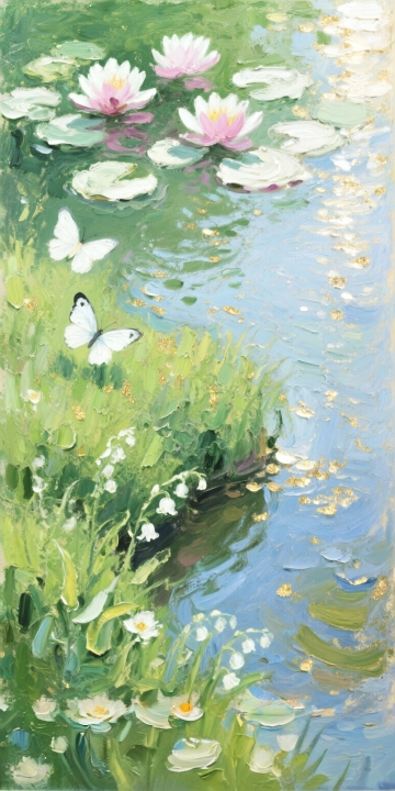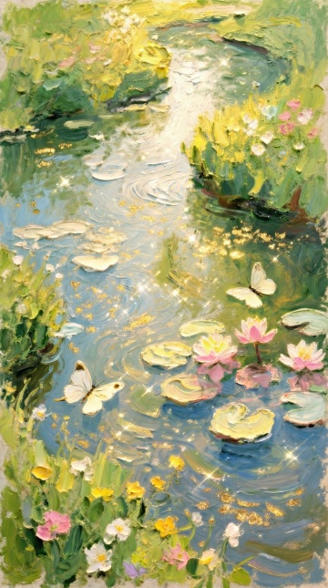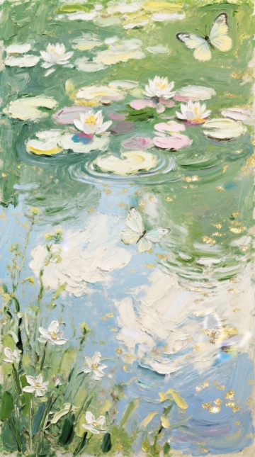 夏日氛围的水面背景,整体色调调整为清新明亮的蓝绿色系,水面上漂浮着翠绿的荷叶和白色的荷花花苞,水面纹理呈现出细腻的波纹和柔和的光斑效果,许多半透明的白色蝴蝶在水面上方轻盈飞舞,画面整体营造出轻盈、梦幻、通透的感觉,光线明亮柔和,带有自然的光晕效果,色彩和谐统一,充满夏日的生机与清凉感。