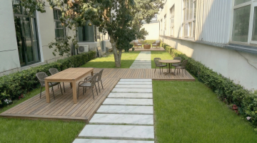 阳光明媚的常规学校操场,红色塑胶跑道上画着清晰的白色分道线,跑道内侧是修剪整齐的绿色草坪,左侧有带遮阳顶棚的蓝色看台座椅,远处背景是绿树和教学楼,天空湛蓝飘着几朵白云,高角度俯拍视角,明亮的自然光,色彩鲜艳饱和,清晰的细节纹理,写实摄影风格。