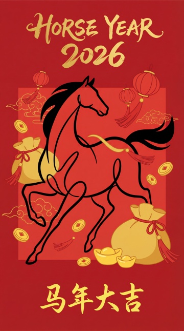 国潮风插画,描边线条勾勒奔马,搭配剪纸元素与鎏金配色,喜庆中式氛围浓厚,寓意马年大吉。