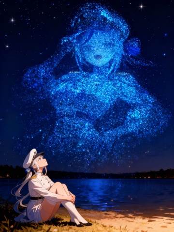 梦幻星空下,少女凝望由蓝色粒子构成的巨影,动漫风与虚拟现实交织,唯美感与静谧感交融,浪漫而超现实。