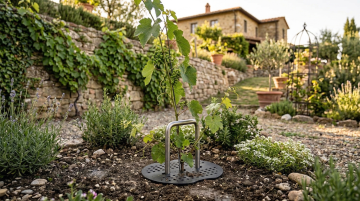 阳光明媚的花园露台餐厅,原木色方形餐桌搭配藤编靠背餐椅,桌面上摆放着白色陶瓷餐具和插满粉色玫瑰的玻璃花瓶,四周被茂密的绿植和盛开的花卉环绕,顶部悬挂着造型简约的白色布艺吊灯,地面铺设浅色防滑地砖,远处可见木质围栏和蓝天白云,整体呈现出清新自然、温馨舒适的田园风格,光线明亮柔和,营造出轻松愉悦的用餐氛围。