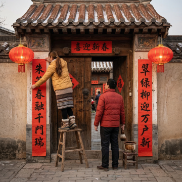 中式宫殿融汇软3D与刺绣风,毛发生长质感屋顶萌趣十足,拟人小熊坐镇屋脊,雪夜灯影间流淌温馨梦幻的春节氛围。
