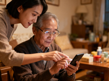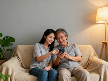 写实风中融入皮肤与布料肌理,光影柔和,展现老人使用手机的温馨瞬间,质朴而舒适,传递日常中的温暖关怀。