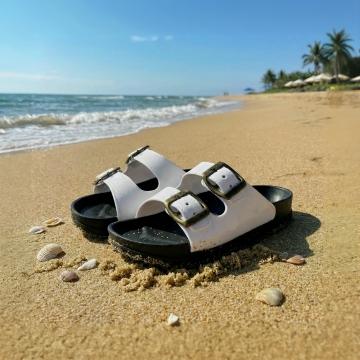简约现代凉鞋,皮影风设计,清爽舒适,海滩实景感。