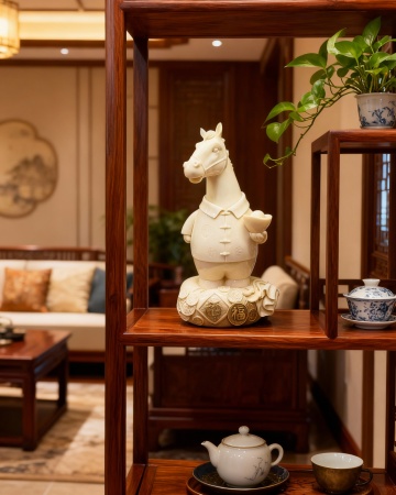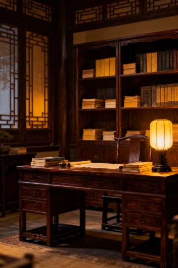 一张木纹桌面上,右侧放置着一个黑色镂空雕花屏风,屏风后有一盆绿色盆景,背景是柔和的暖黄色调,光线从左上角斜射过来,在粗糙质感的墙面上投下斑驳的光影,营造出宁静而古朴的氛围,环境变换为传统中式书房的角落,光线柔和温馨,整体风格统一且具有古典韵味。