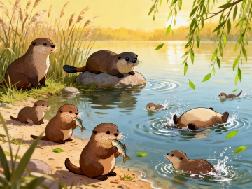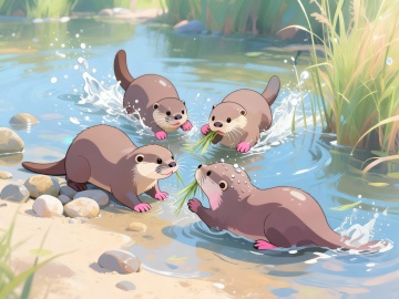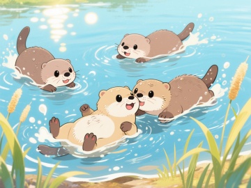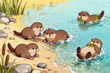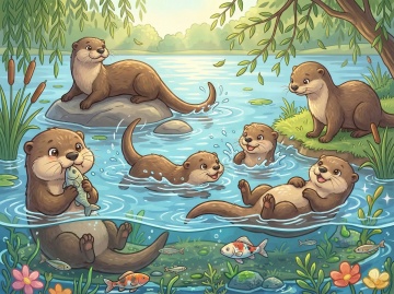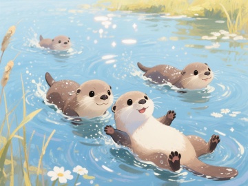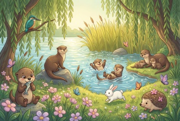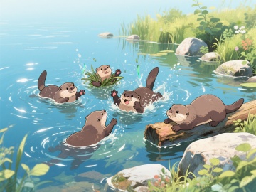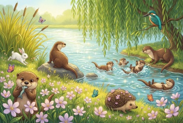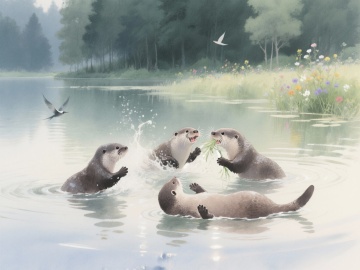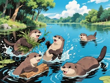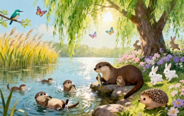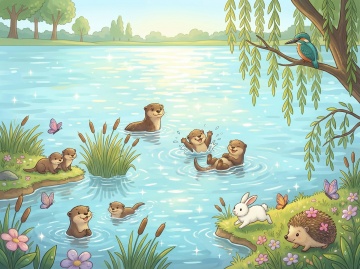 清新水彩插画风,蓝天绿地映衬河流,自然和谐,充满生机。