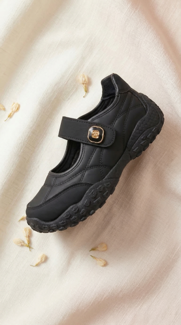 轻拟物风设计,黑色绗缝面料鞋身搭配金色扣饰,融合舒适感与时尚优雅,实景布艺背景烘托质感,展现现代简约美学。