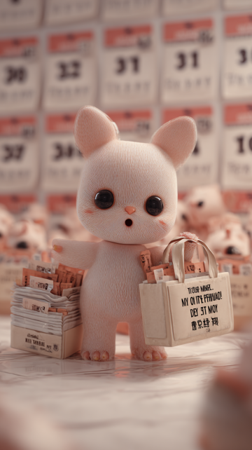 软3D风拟人小猫,面料质感细腻,手持购物袋与纸盒,背景日历模糊,营造梦幻柔和氛围,充满可爱卡通感。