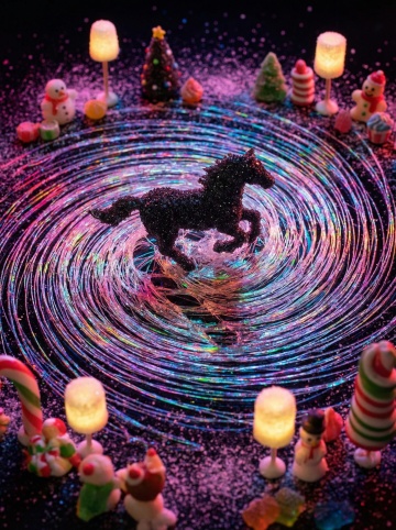 梦幻感与酷炫感交织的微缩艺术风圣诞场景,粒子光轨环绕着闪耀黑马,搭配卡通雪人与糖果元素,营造迷幻又甜美的虚拟现实节日氛围。