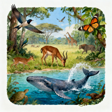 清新水彩插画风,蓝天绿地映衬河流,自然和谐,充满生机。