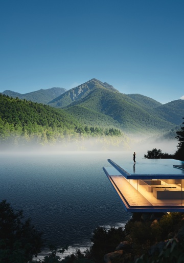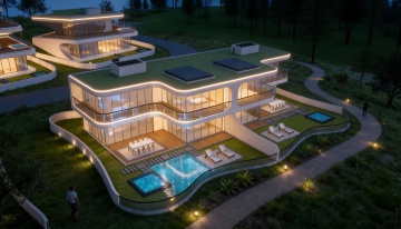 现代风格别墅,位于缓坡之上,整体呈现白色与木质棕色搭配的外立面,大面积落地玻璃窗,内部灯火通明,悬挑式露台设计,周围环绕修剪整齐的绿色草坪、低矮灌木、石阶小径,背景是傍晚时分的淡蓝色天空,远处有模糊的山脉轮廓,光线柔和,营造出宁静而高端的居住氛围。