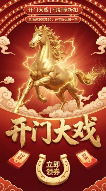 3D重拟物风格,鎏金骏马踏云奔腾,闪电环绕,光影闪耀,浮雕质感文字与祥云烘托喜庆奢华氛围,传递新年开门红的节日礼遇。