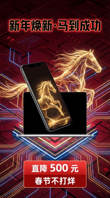 赛博朋克风融合鎏金粒子马,霓虹电路背景,科技感十足,手机屏幕延伸虚拟现实骏马,新春促销氛围浓厚。