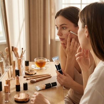 微缩艺术风与3D混合材质结合,超现实主义呈现肌肤焕新过程,科技感与柔和感交织,展现现代护肤的精密与舒适体验。