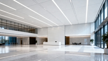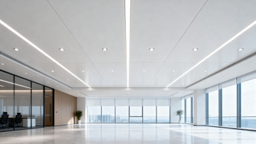 极简主义风格的现代办公室内部,开放式布局,浅灰色地毯,白色墙壁,大面积落地窗引入充足自然光,窗外可见城市天际线,天花板悬挂线性LED灯带与白色吸音板,黑色金属框架办公桌搭配浅色桌面,米白色隔断屏风,黑色人体工学办公椅,桌上配备电脑显示器,绿色盆栽点缀空间,整体色调以灰白、原木色、黑色为主,干净利落的线条,清晰的光影层次,高清晰度,专业办公环境氛围,不同环境(如增加休闲区、会议室入口、前台区域等),不同角度(如从落地窗向外拍摄、从办公桌之间穿行视角、天花板俯视角等)的办公室背景。