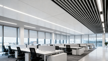 现代简约风格的办公室环境,开放式办公区布局,浅灰色与白色为主的中性色调,大面积落地玻璃窗引入明亮自然光,搭配白色条形吊灯和嵌入式筒灯提供均匀照明,灰色几何图案地毯覆盖地面,白色办公桌配深灰抽屉柜,黑色框架米色坐垫办公椅,办公桌间有半人高白色隔断,角落摆放大型绿植增添生机,金属与玻璃材质的百叶窗隔断,办公桌上配有笔记本电脑和黑色办公电话,整体空间干净整洁、通透开阔,光线充足柔和,营造出专业高效且舒适的工作氛围。