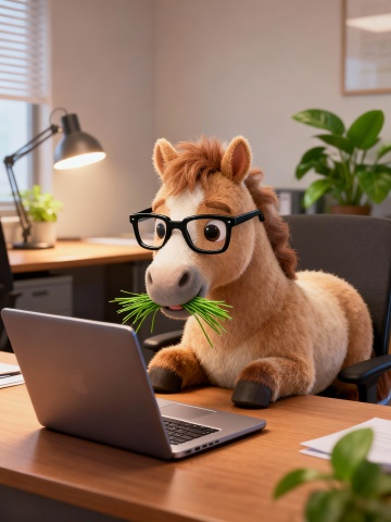 软3D风卡通马戴眼镜办公,拟人化设计融合清新趣味感,毛发生长细节精致,现代商务场景中展现幽默创意。