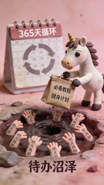 粘土风3D拟人场景,卡通马手持教程坠入“待办沼泽”,手写“明天再做”浮雕手伸出泥潭,背景日历循环暗喻拖延,趣味感十足。