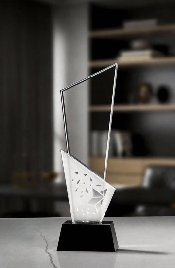 一个透明水晶材质的奖杯,主体呈流线型向上收窄的几何形态,顶部镶嵌着一颗立体的金色五角星,底座为双层圆形金色金属结构,整体呈现出光滑的表面质感和清晰的棱角,高光部分明亮,阴影过渡自然,置于纯白色的纯色背景上。