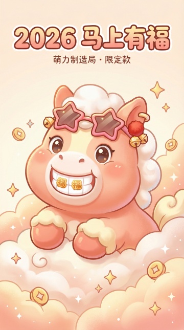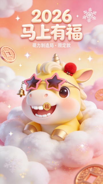 软3D风萌马戴星形墨镜,云朵环绕,鎏金元素点缀,喜庆梦幻,2026新年限定款,可爱感爆棚。
