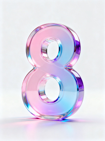 未来感与科技感交织的3D玻璃数字“8”,清透梦幻,重拟物风呈现极致体积感,极繁主义光影折射,宛如节日庆典中的璀璨符号。