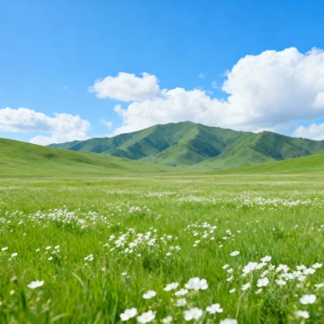 阳光明媚的户外场景,一片生机盎然的绿色草地,草地上点缀着白色的小花,远处是茂密的树林,天空湛蓝,飘着几朵白云,光影效果自然,呈现出不同的户外自然景观风格,可能是森林边缘的开阔草地,也可能是山间的平缓草甸,整体氛围清新自然,充满活力。