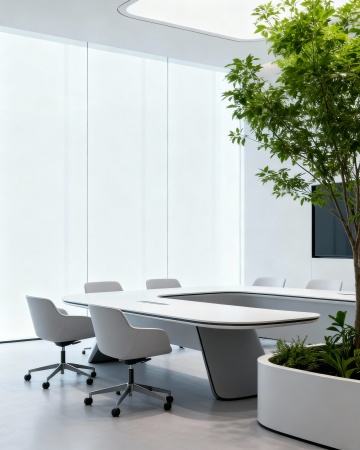 极简主义风格的现代办公室内部,开放式办公布局,浅木色办公桌整齐排列,配备灰色办公椅与黑色电脑显示器,大面积落地窗引入明亮自然光,天花板装有长条形LED白色照明灯管,地面铺设浅灰色地毯,角落摆放绿色大型绿植,整体色调以白色、浅木色、灰色为主,呈现简洁、专业、通透的氛围,不同环境角度下的办公室背景,保持相同的极简现代风格与色彩搭配。