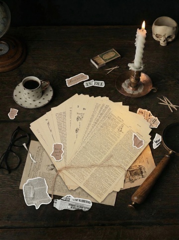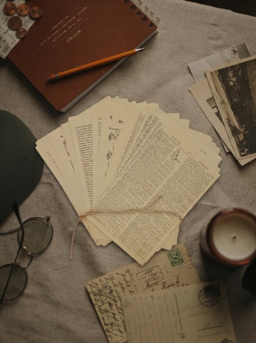 一张复古风格的报纸背景,报纸纸张呈现出陈旧的米黄色调,边缘有不规则的撕裂和磨损效果,仿佛历经岁月沧桑。报纸上布满了密密麻麻的黑色文字,字体为老式衬线体,排版紧凑,具有强烈的年代感。中间区域是大面积的留白,形成一个不规则的空白框架,整体营造出一种怀旧、复古的氛围。