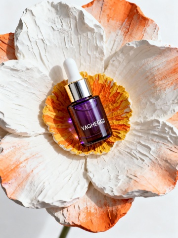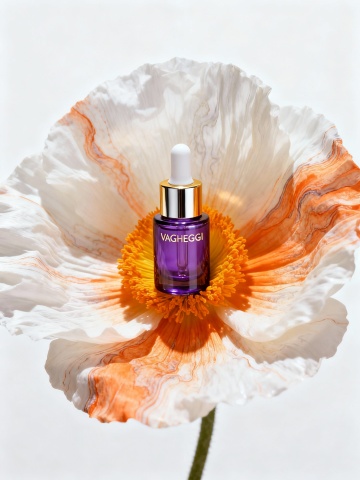 清新玻璃瓶置于虚拟自然水景中,花影轻舞,尽显清爽与清透感。