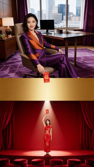 中式复古风,红金刺绣旗袍搭配鎏金马具,手持灯笼,尽显国潮奢华与优雅喜庆之美。