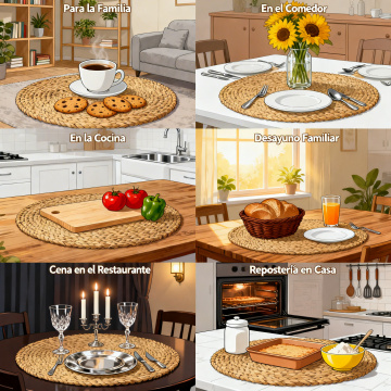 插画风水彩质感,轻拟物设计,展现温馨舒适的家庭与餐厅场景,质朴编织餐垫贯穿多情境,传递日常生活的温暖与仪式感。