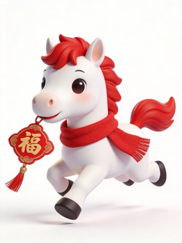 软3D风格的拟人化小马,红白配色充满喜庆感,毛发生长风细节生动,手持“福”字挂饰,卡通感十足,传递春节欢乐氛围。