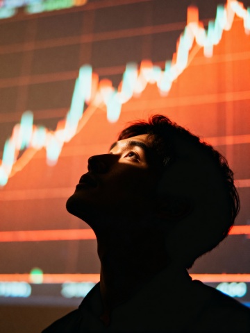 赛博朋克风格的金融数据可视化场景,深蓝色与霓虹粉为主色调,光线呈现科技感十足的蓝色光源与粉色高光交织,具有强烈的光影对比和细腻的阴影细节,前景是由蓝色网格线和动态波动的红色柱状图表构成的数据界面,图表线条流畅且带有发光效果,背景为深邃的宇宙星空,点缀着闪烁的星辰和星云,营造出神秘而充满未来感的氛围,整体画面采用近景聚焦数据图表、远景虚化星空的景深控制,呈现出清晰的视觉层级,科技感十足的数字艺术风格,强调数据流动的动态美感与宇宙空间的广阔深邃,信息传达高效且符合科技与金融融合的主题。
