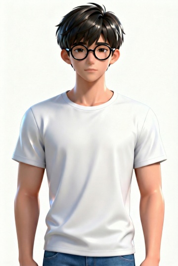 一位年轻男学生,戴着黑色圆框眼镜,身穿纯白色短袖T恤和蓝色牛仔裤,人物姿态端正,白色背景的3D动漫人