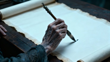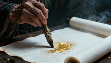 中式风格,干净画面,适用背景素材,特写视角下微微卷起的古旧宣纸书卷,上面布满工整的黑色毛笔小楷汉字,纸张呈现自然的黄褐色调与细腻纹理,柔和的侧光从左上方照射,在书卷边缘形成清晰的明暗对比与温暖高光,背景是模糊的水墨风格远山轮廓,整体营造出宁静、古朴、富有文化底蕴的氛围,画面简洁雅致,留白恰当,无任何文字信息干扰。