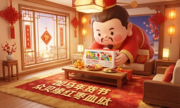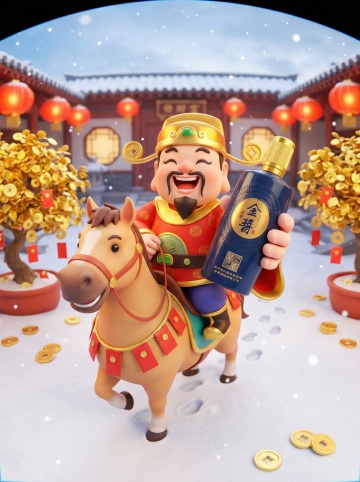 国潮风3D卡通财神骑马送年货,拟人化设计融合喜庆红金配色,软3D质感增强体积感,传递节日欢乐氛围。